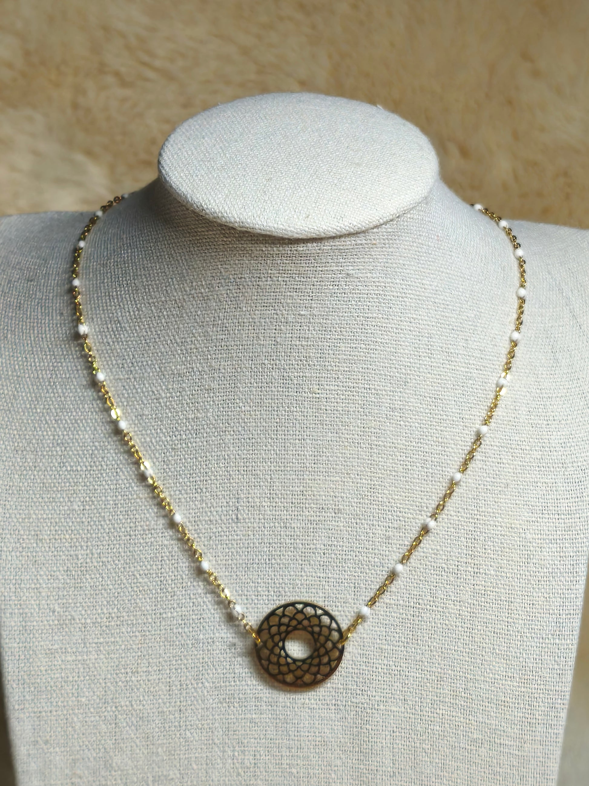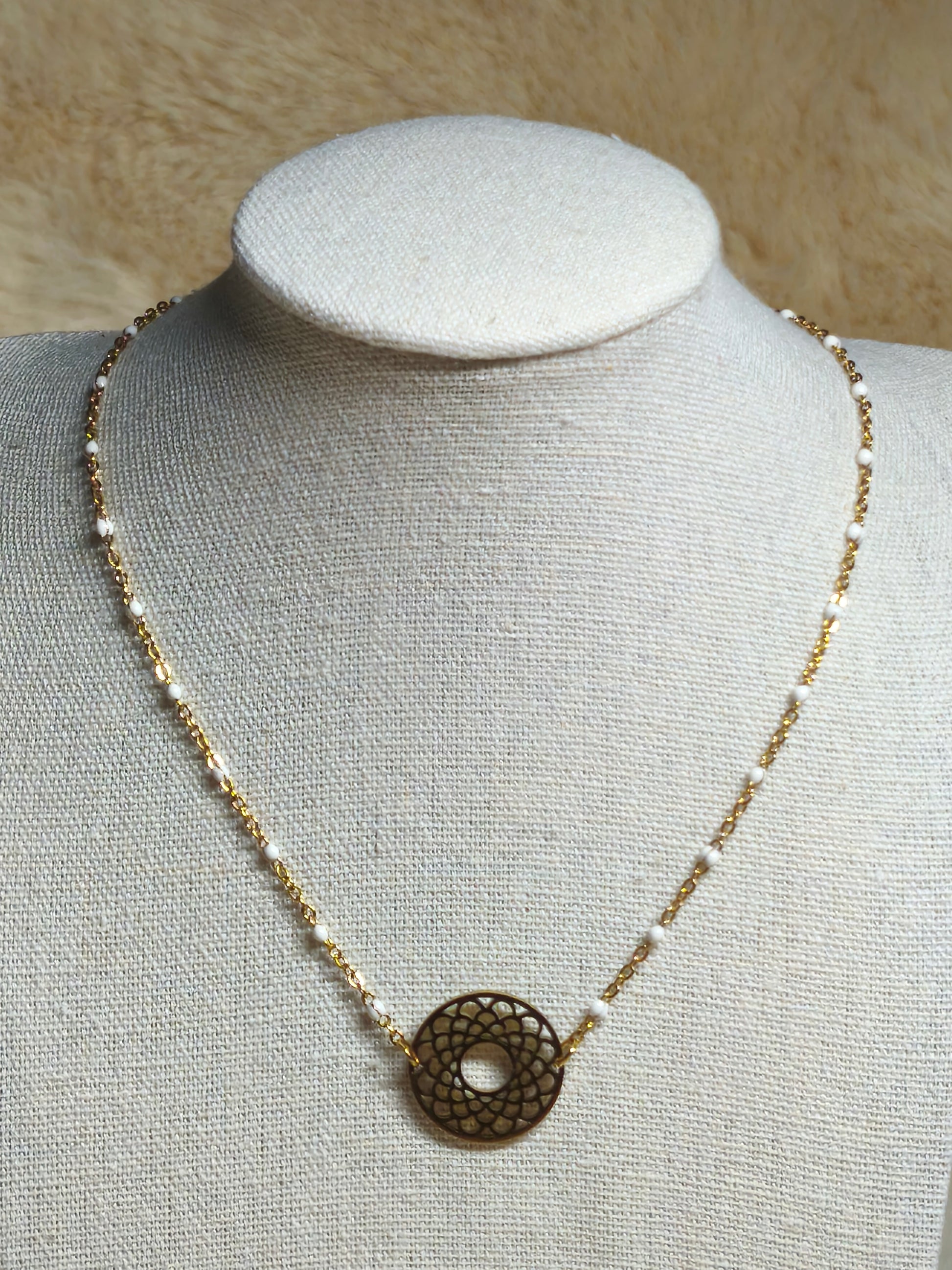 Le collier ANNIE associe une breloque mandala en acier inoxydable doré à une chaîne disponible en plusieurs coloris, offrant ainsi une personnalisation élégante. Sa taille réglable (35,5 cm + 5 cm de rajout) permet un porté confortable et adapté à chaque morphologie. Confectionné artisanalement, ce bijou allie savoir-faire et matériaux de qualité pour une pièce à la fois résistante et raffinée.