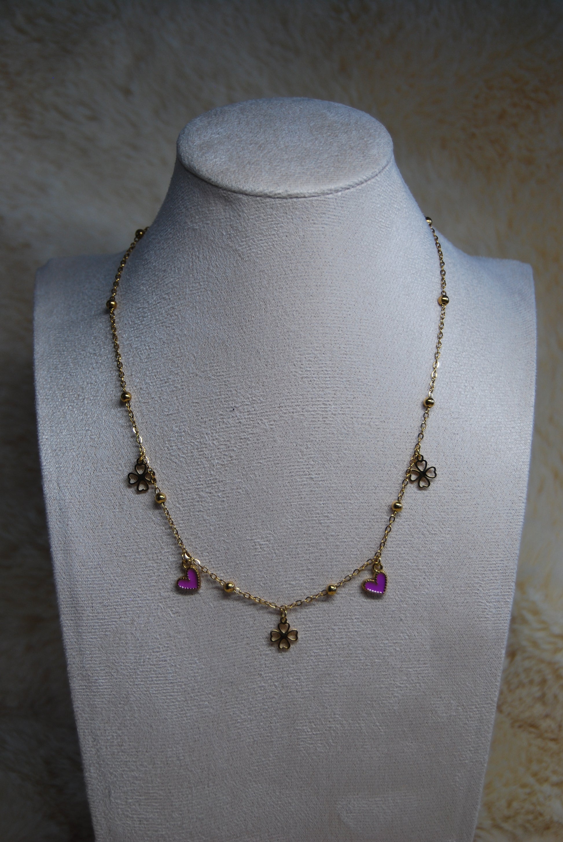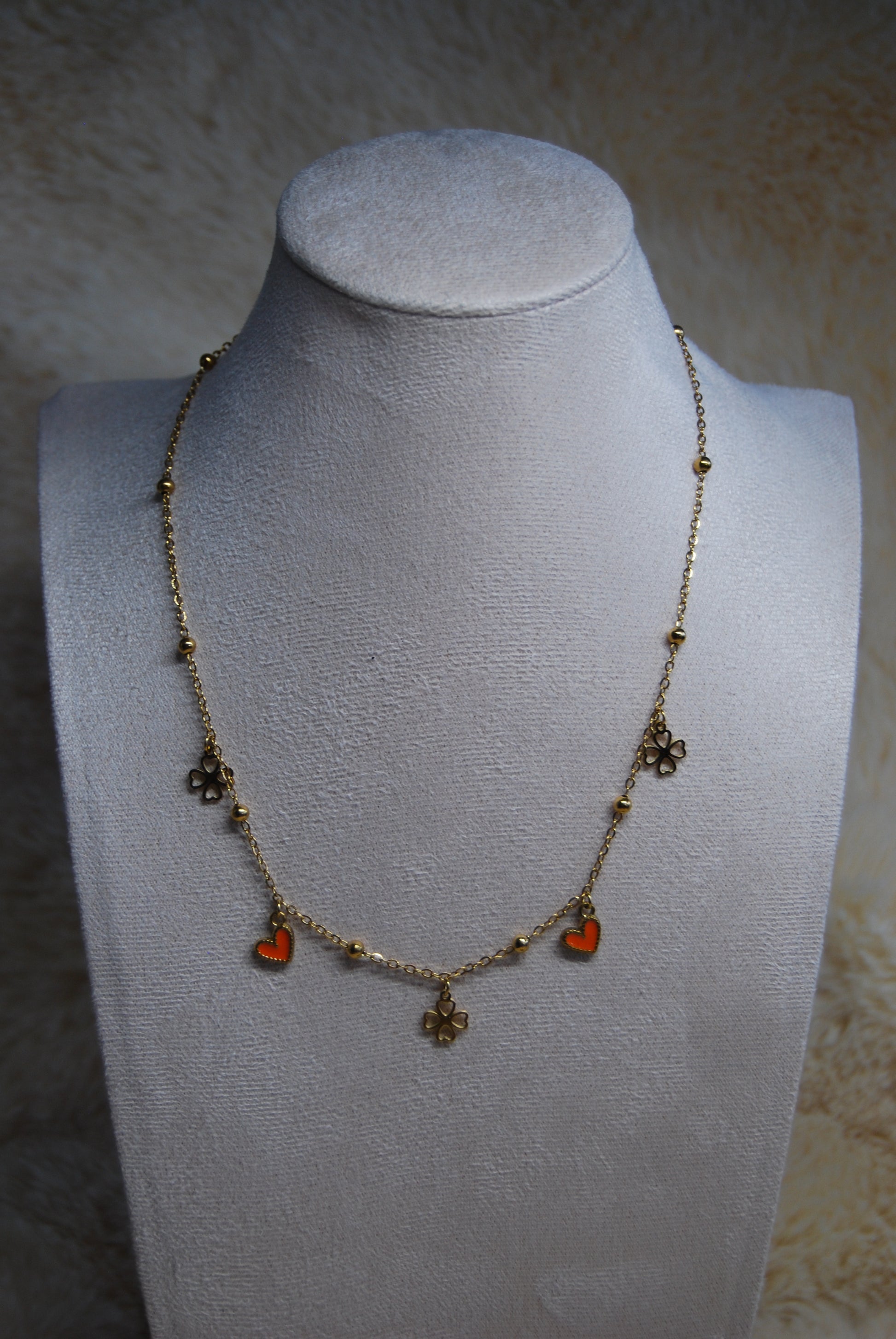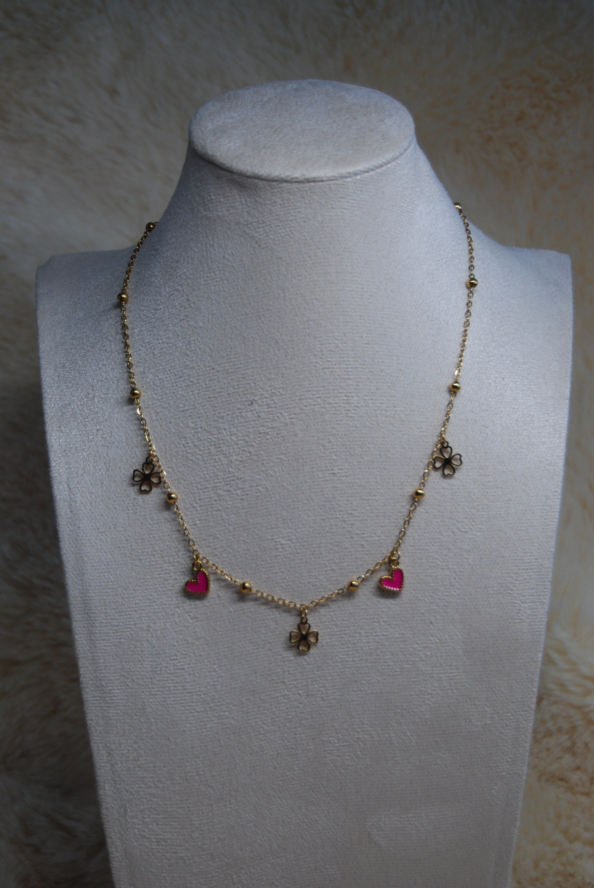 Collier en acier inoxydable doré mettant en avant des trèfle porte-bonheur accompagné de cœurs aux teintes variées, soigneusement sélectionnées. La chaîne réglable garantit un ajustement optimal pour tous les morphologies. Cette création conjugue symbolique positive et raffinement épuré, idéale pour affirmer votre style avec subtilité ou offrir un présent chargé de sens. Création artisanale.