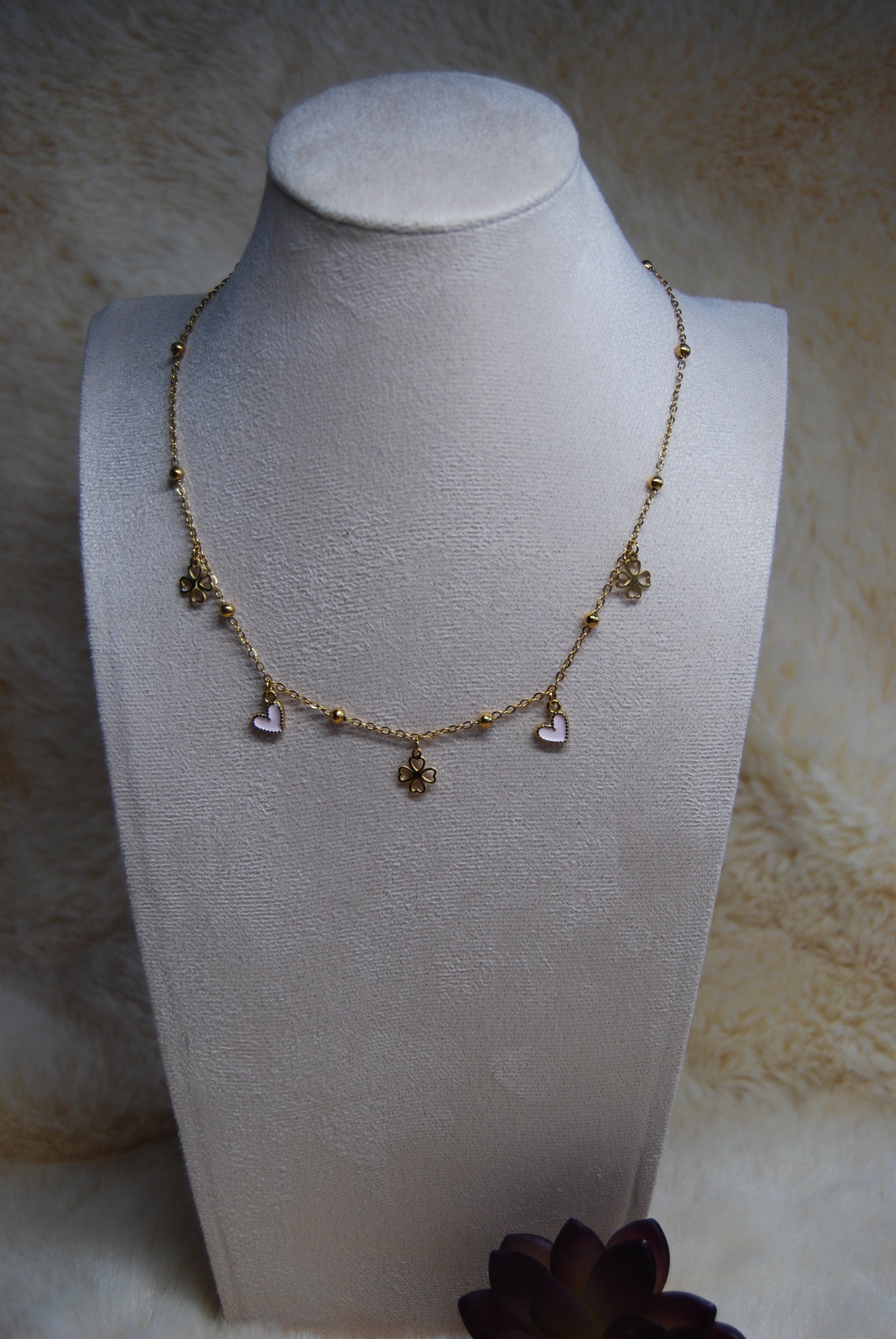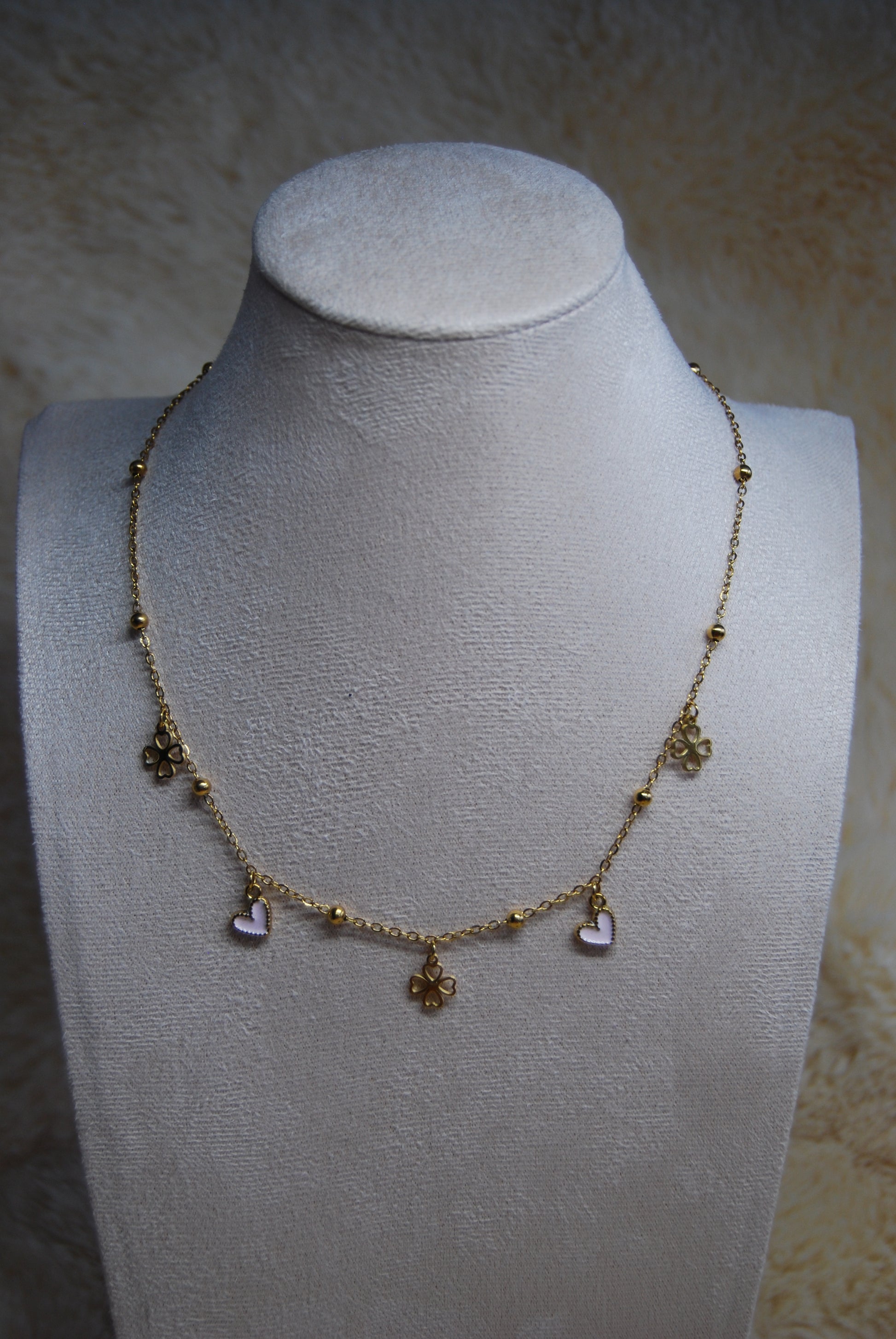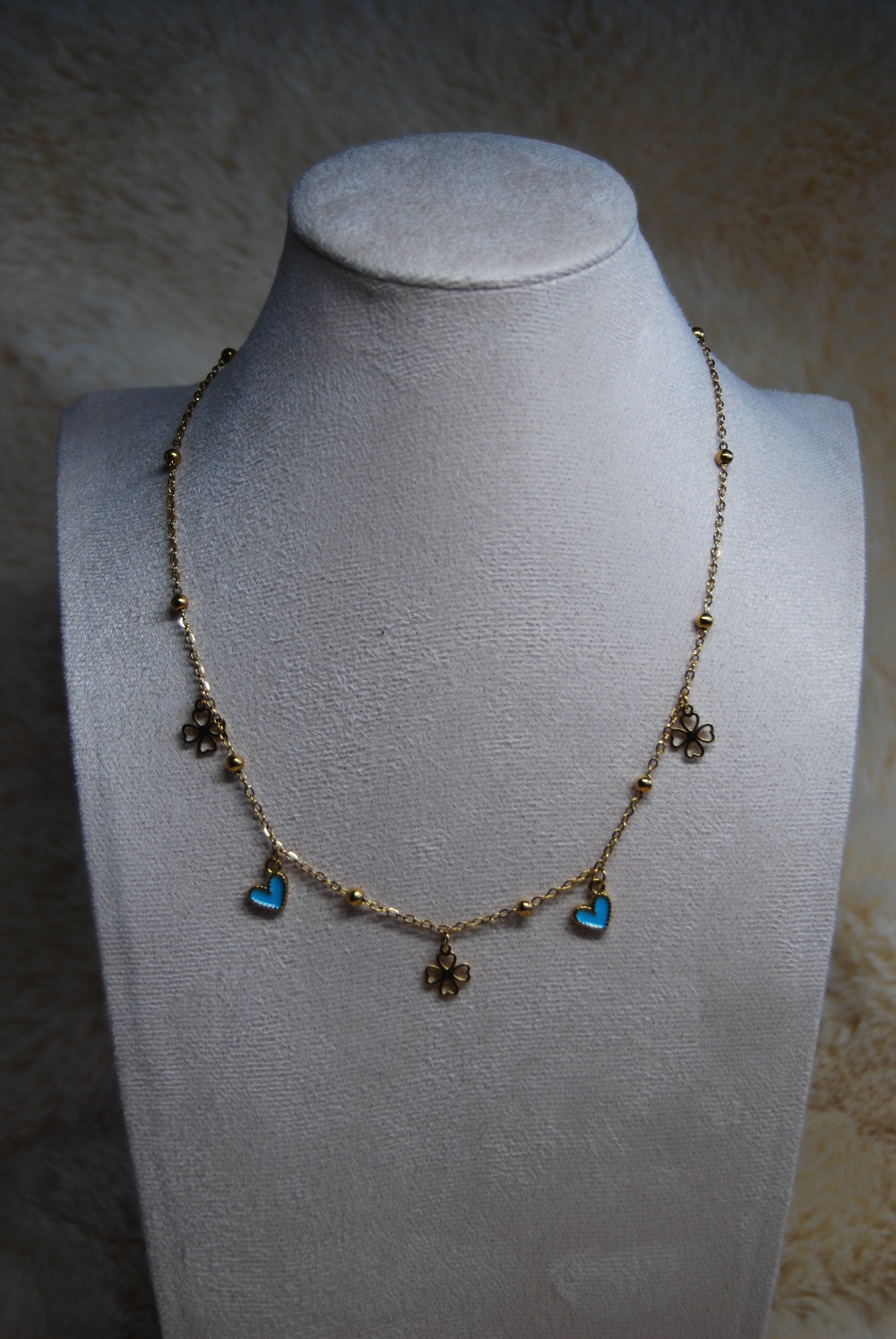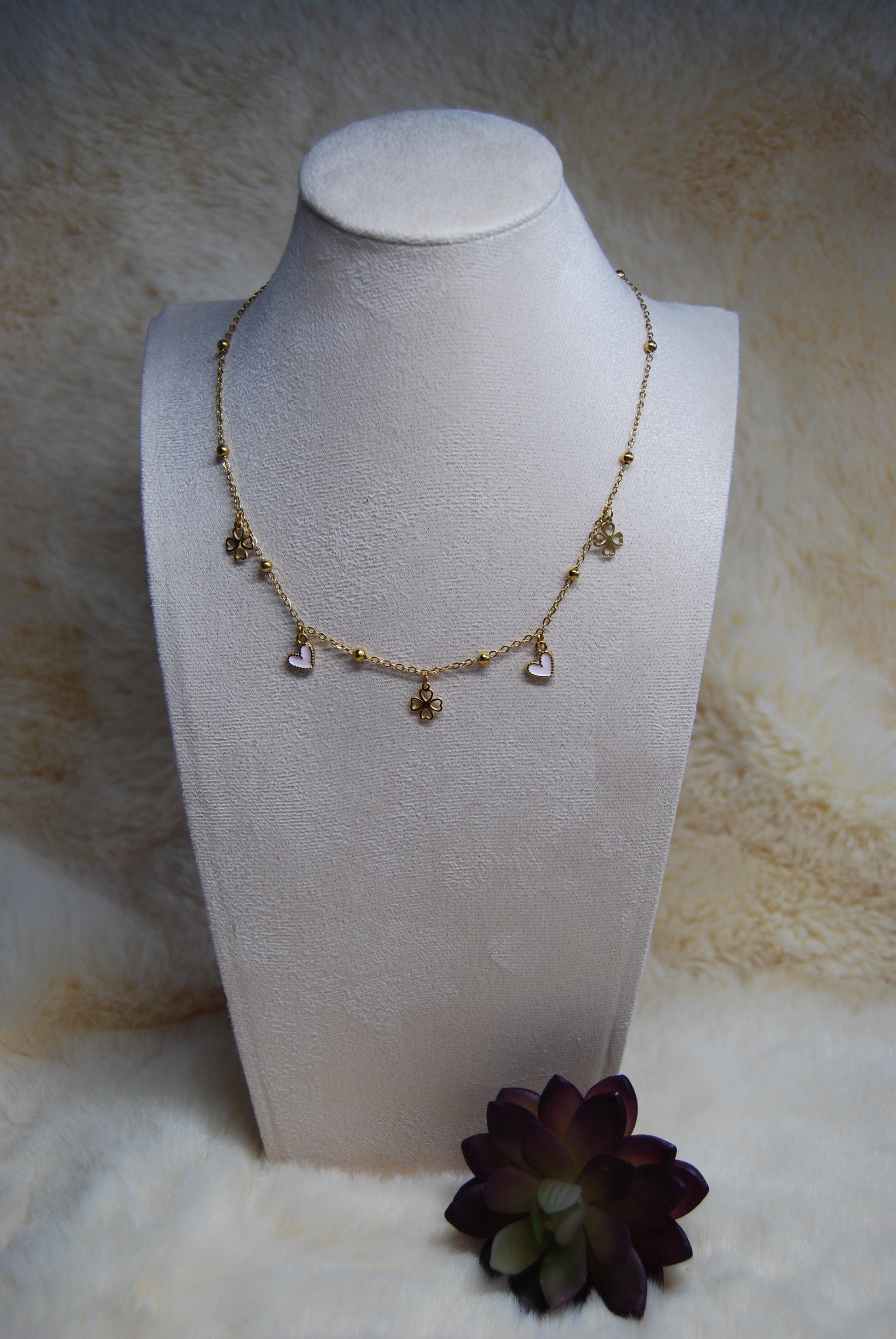 Collier en acier inoxydable doré mettant en avant des trèfle porte-bonheur accompagné de cœurs aux teintes variées, soigneusement sélectionnées. La chaîne réglable garantit un ajustement optimal pour tous les morphologies. Cette création conjugue symbolique positive et raffinement épuré, idéale pour affirmer votre style avec subtilité ou offrir un présent chargé de sens. Création artisanale.