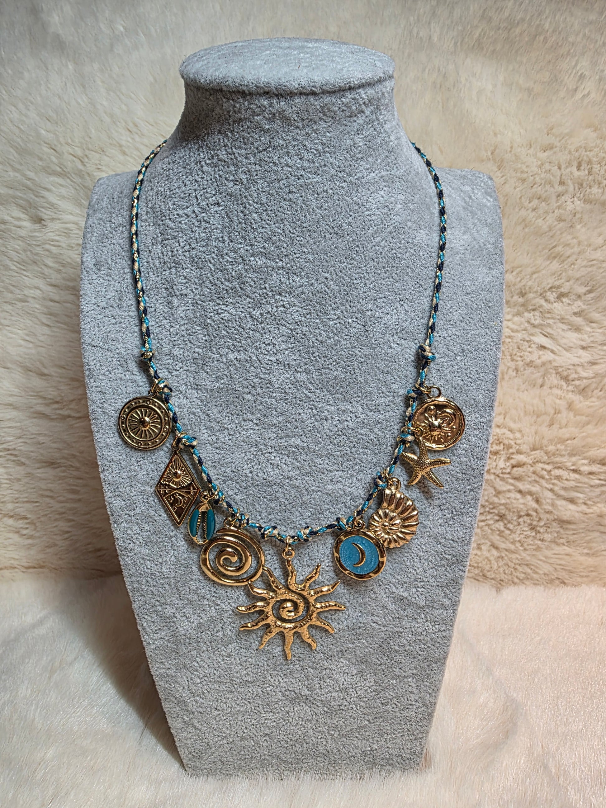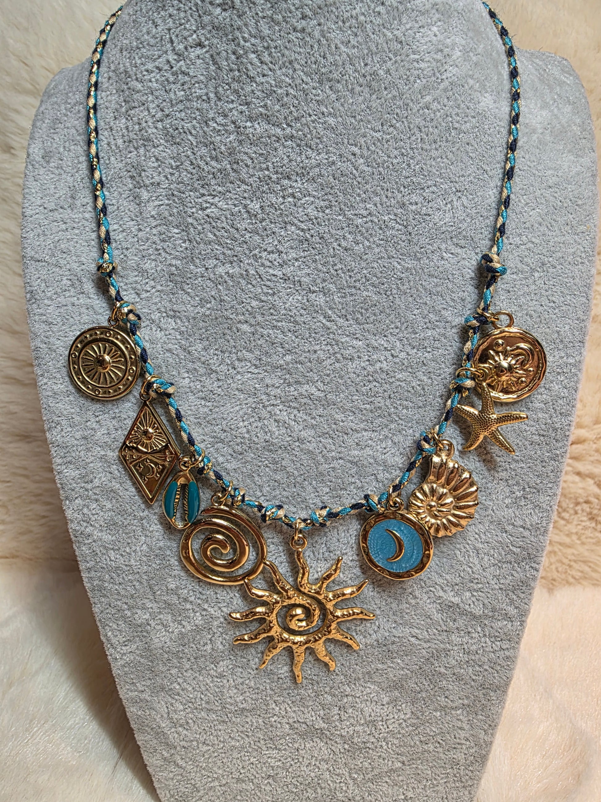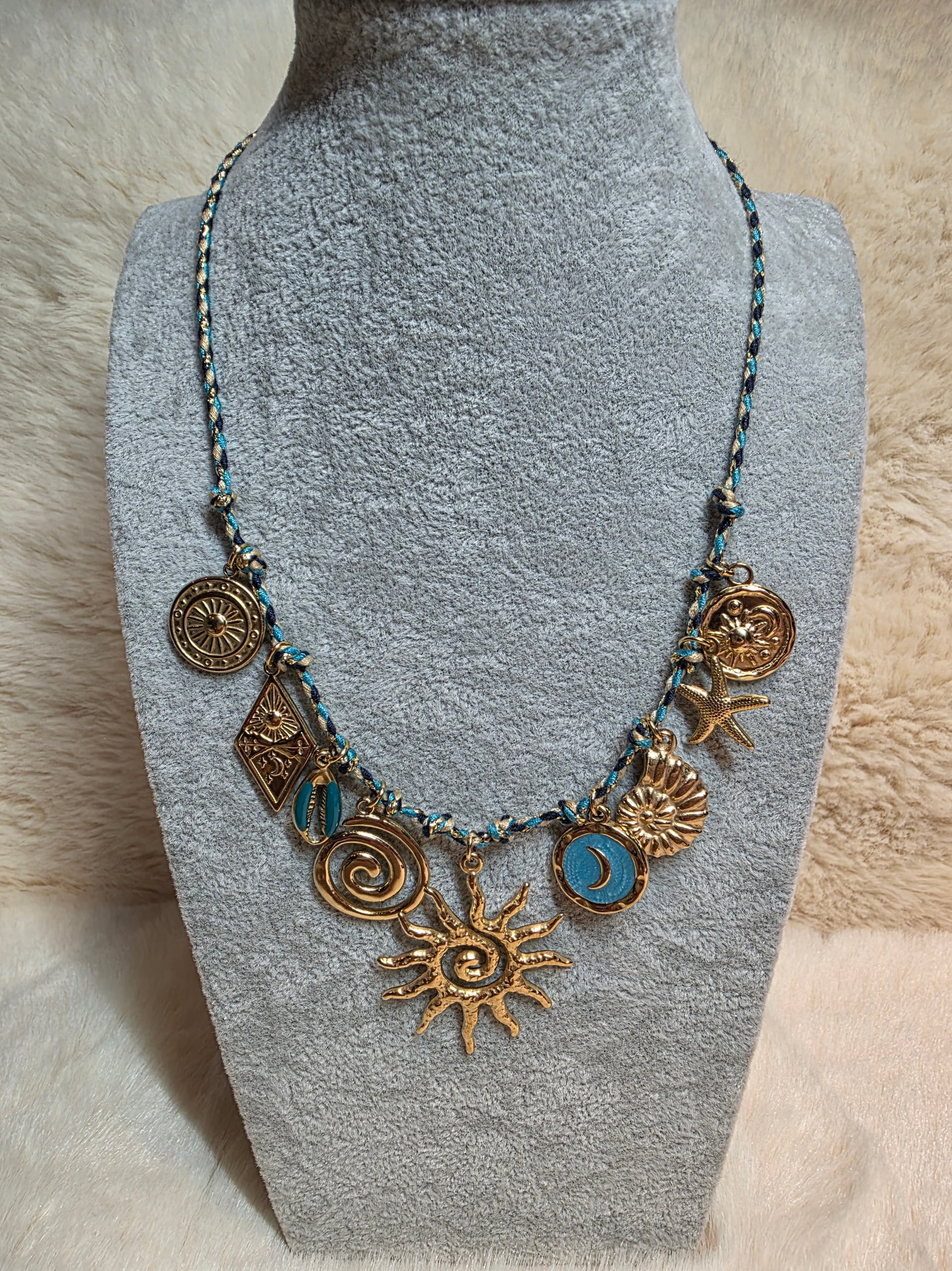 Ajoutez une touche d’élégance décontractée avec notre collier cordon bleu, noir et beige. Ses breloques en acier inoxydable résistantes brillent avec style, tandis que la taille réglable (37,5 cm + 5 cm de rajout) assure un confort parfait pour toutes les occasions. Une création artisanale unique, idéale pour égayer vos tenues avec une pointe de charme espiègle.