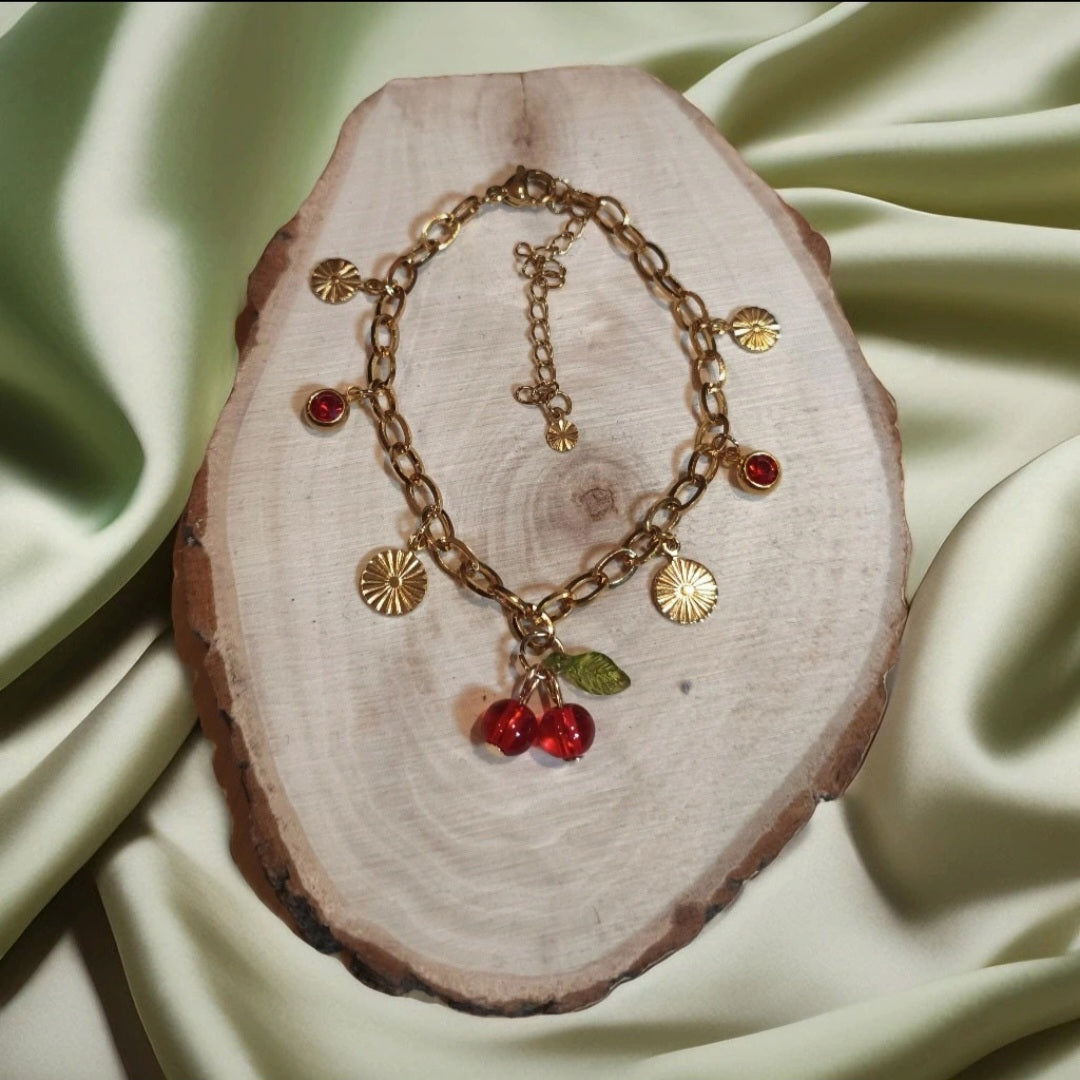Ajoutez une touche joyeuse et lumineuse à votre poignet avec ce bracelet en acier inoxydable doré orné de breloques cerises charmantes. Sa taille réglable (17 cm + 5 cm de rajout) s’adapte parfaitement à votre poignet, alliant confort et style unique. Chaque création artisanale est pensée pour égayer vos journées avec une note fruitée et ludique.