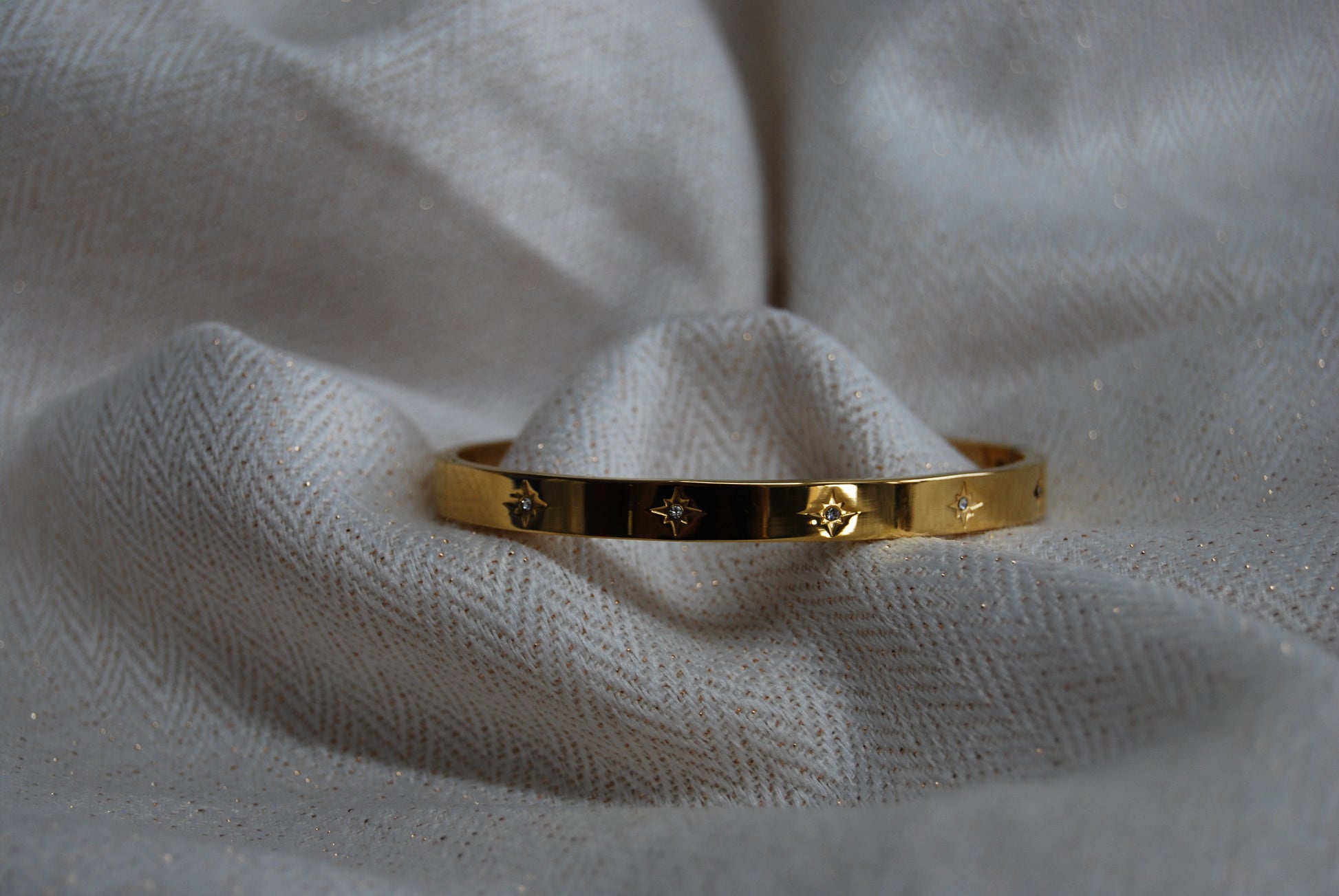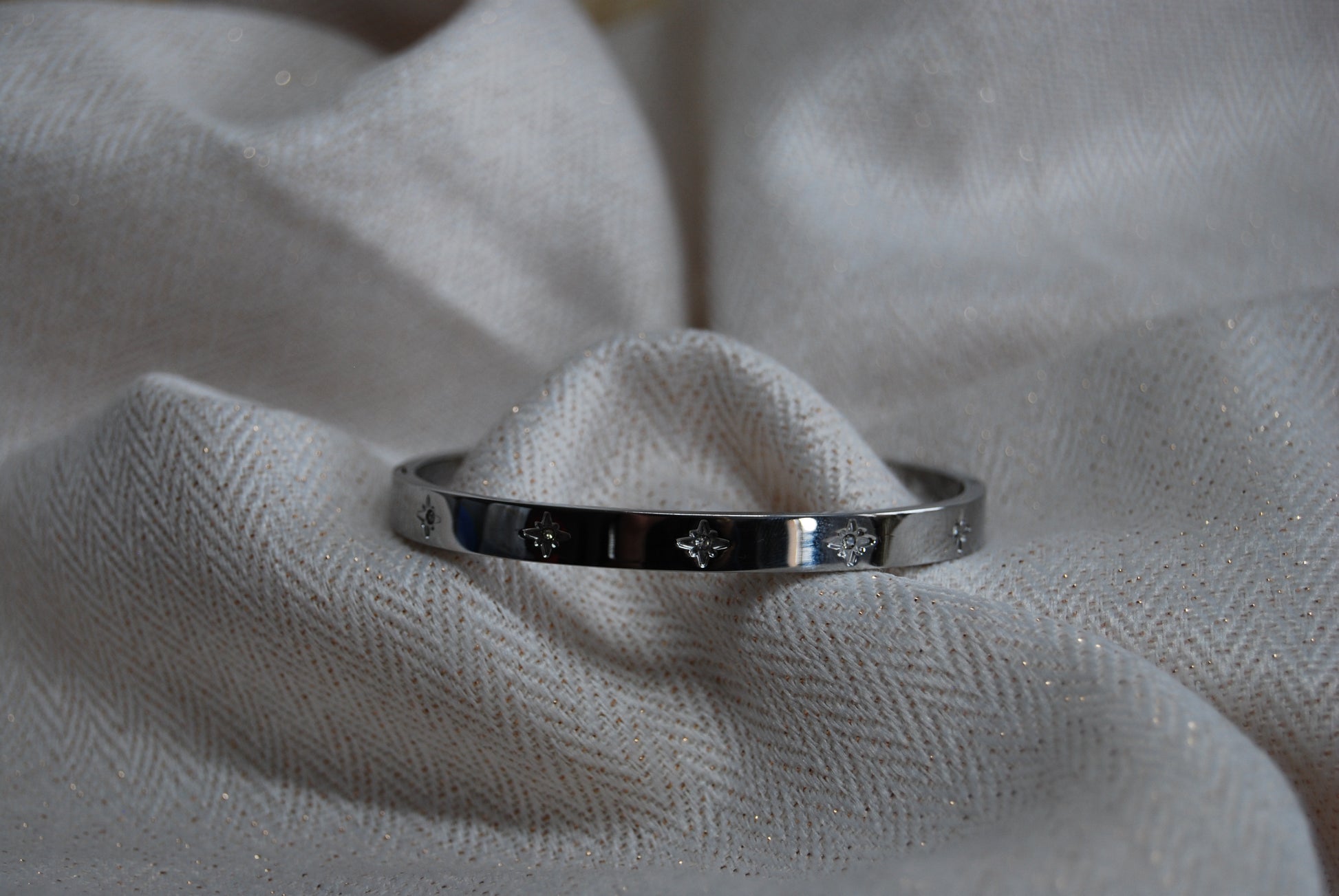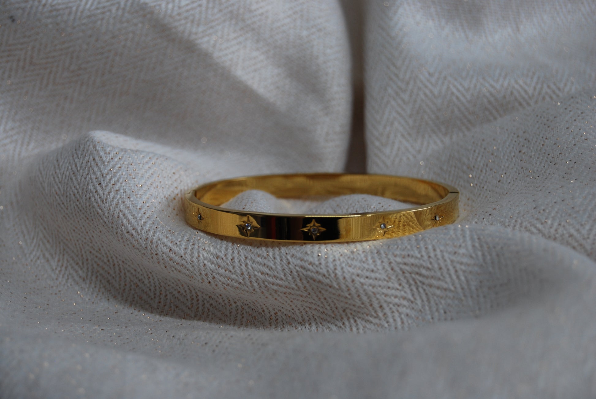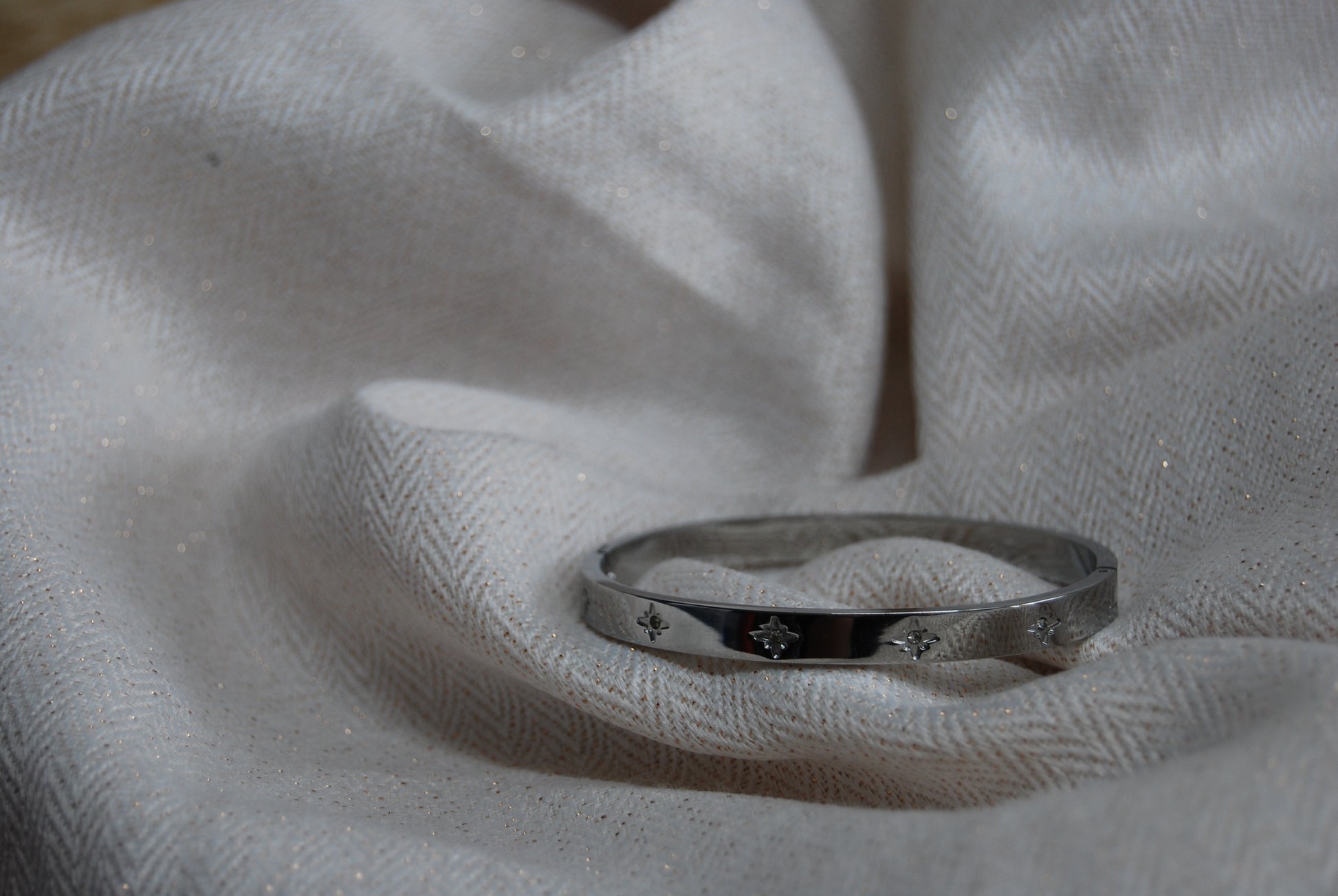Bracelet rigide ISAURE : audacieux et intemporel. Ce jonc en acier inoxydable épousera votre poignet avec élégance, disponible en finition dorée ou argentée. Les strass qui scintillent tout autour créent un effet de lumière captivant, parfait pour affirmer votre style. Résistant et hypoallergénique, ce bijou accompagne vos plus beaux moments sans compromis.