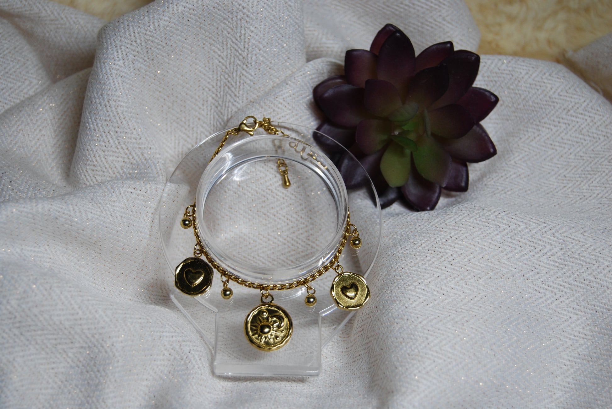 Découvrez LYA, le bracelet qui se réinvente au gré de vos envies ! Confectionné en acier inoxydable doré ou argenté, ce bijou artisanal arbore des breloques délicates qui racontent votre histoire. Grâce à sa taille réglable (15 cm + 5 cm de rajout), il épouse parfaitement votre poignet pour un confort optimal. Chaque création est unique, façonnée avec soin pour sublimer votre style au quotidien. Un accessoire intemporel qui se porte seul ou en accumulation pour plus de caractère.