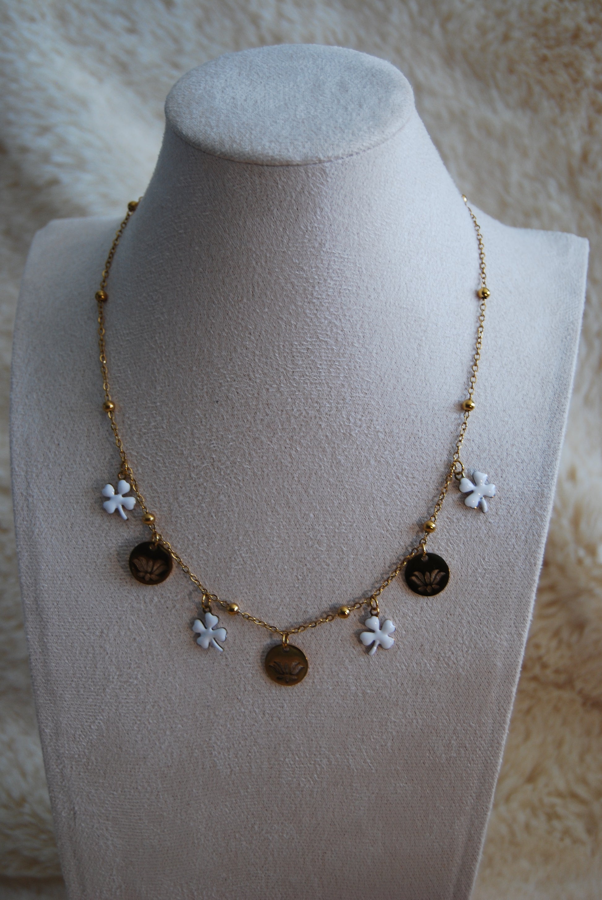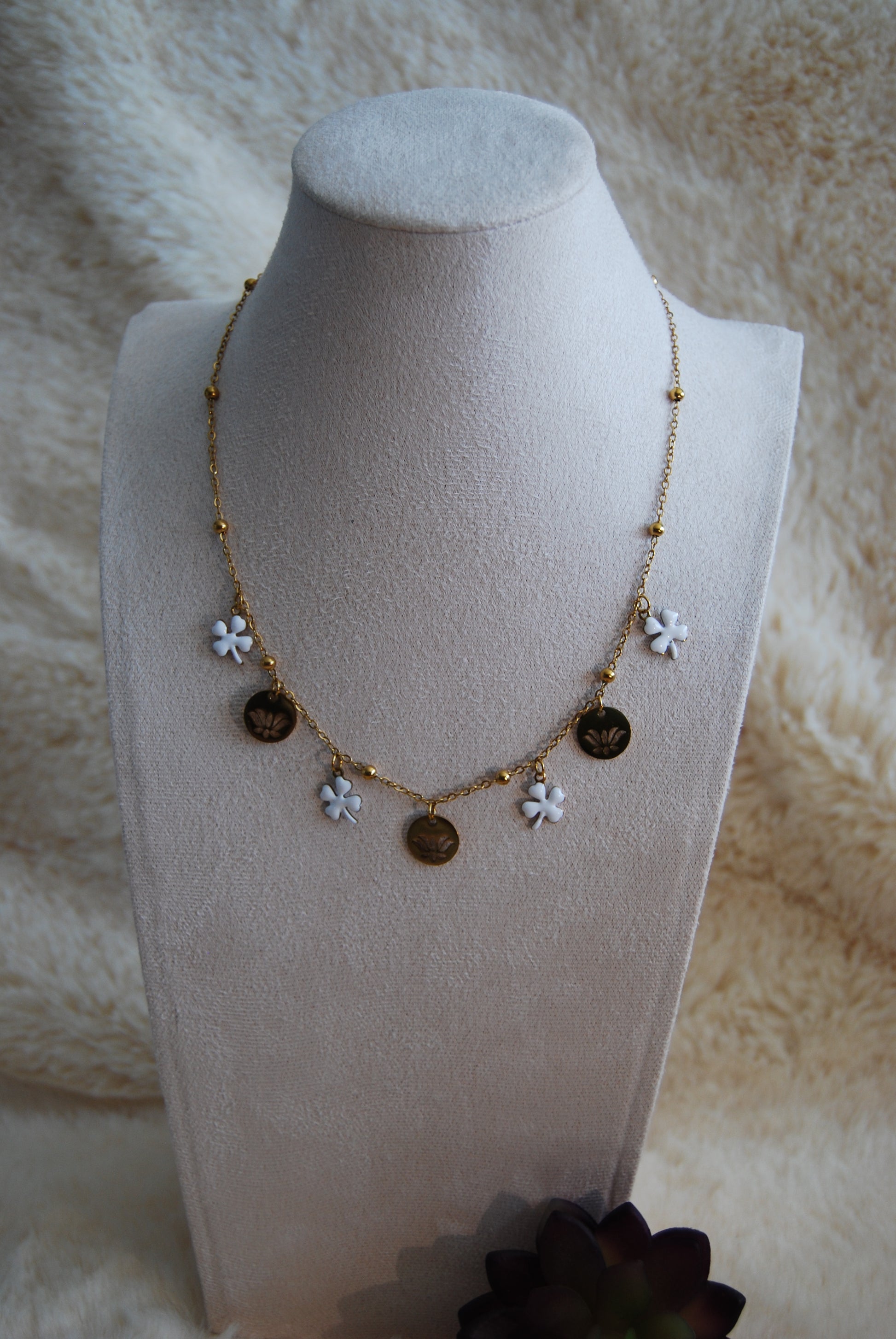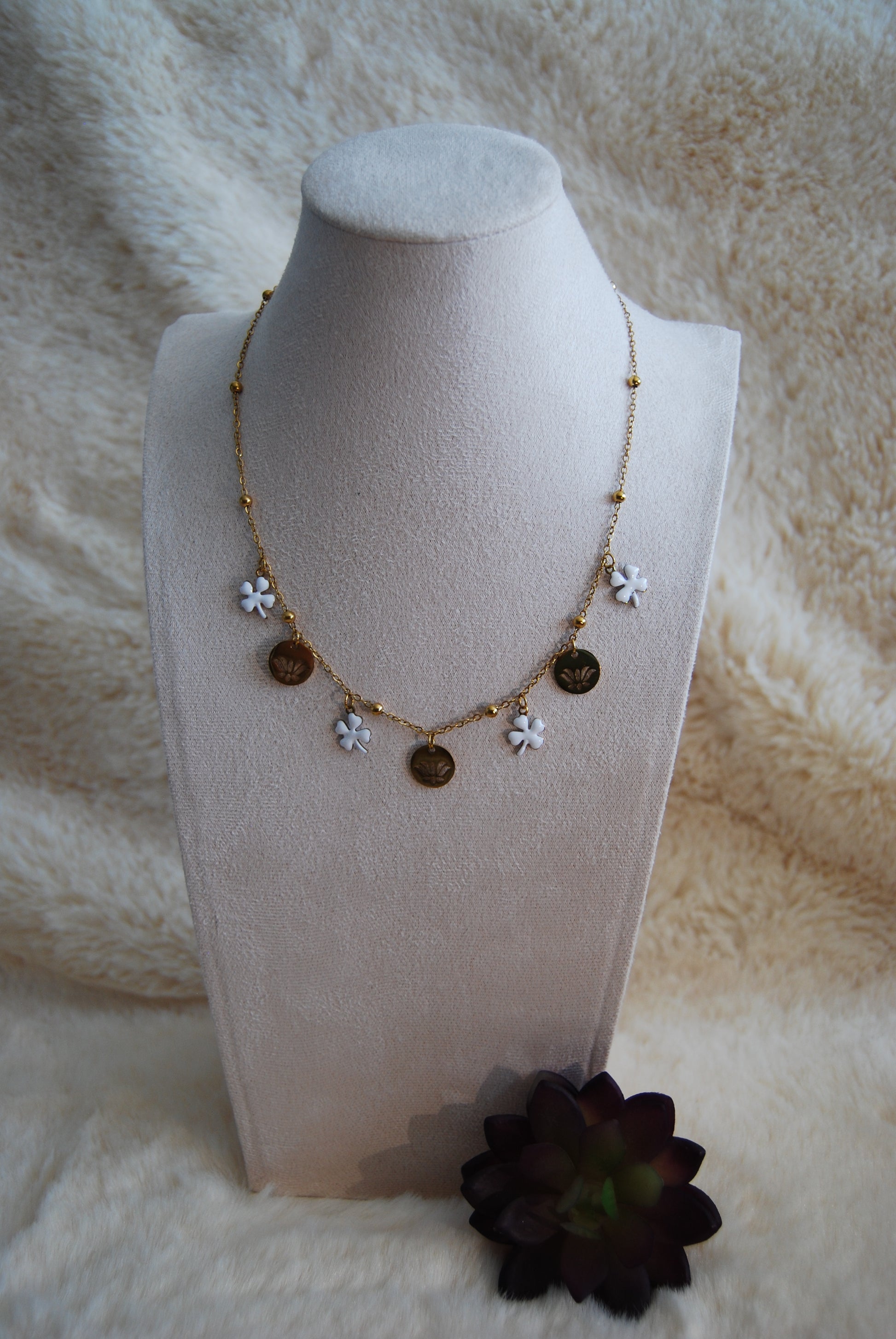Découvrez LYA, un collier en acier inoxydable doré qui fusionne élégance et audace. Ses breloques trèfle et lotus incarnent la chance et la sérénité, deux forces qui se rencontrent pour créer un accessoire chargé de sens. Réglable à votre convenance, ce bijou artisanal s'adapte à vos envies du jour. Chaque création porte la signature d'un savoir-faire unique, loin des productions de masse. Portez LYA et affirmez votre style avec caractère.