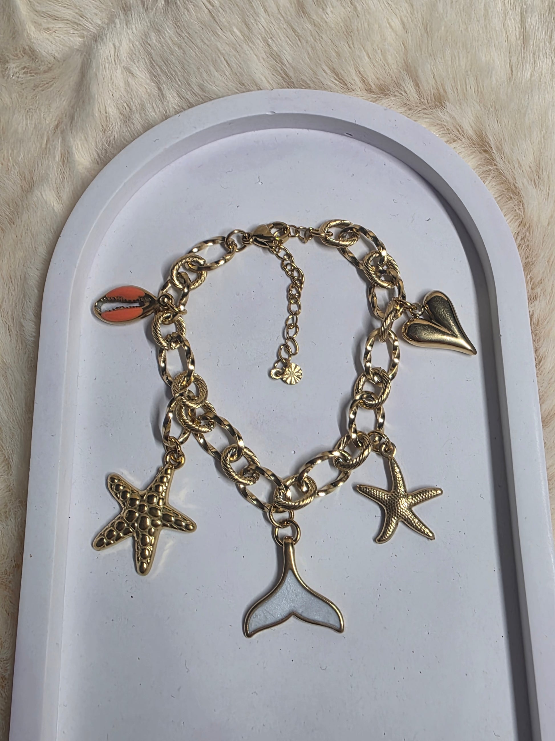 Apportez une touche ensoleillée à votre style avec le bracelet SUMMER ! En acier inoxydable doré, il scintille de mille feux et s’adapte parfaitement à votre poignet grâce à sa taille réglable (16 cm + 5 cm de rajout). Ses breloques délicates racontent une histoire, parfaite pour égayer vos journées avec une note joyeuse et unique. Création artisanale.